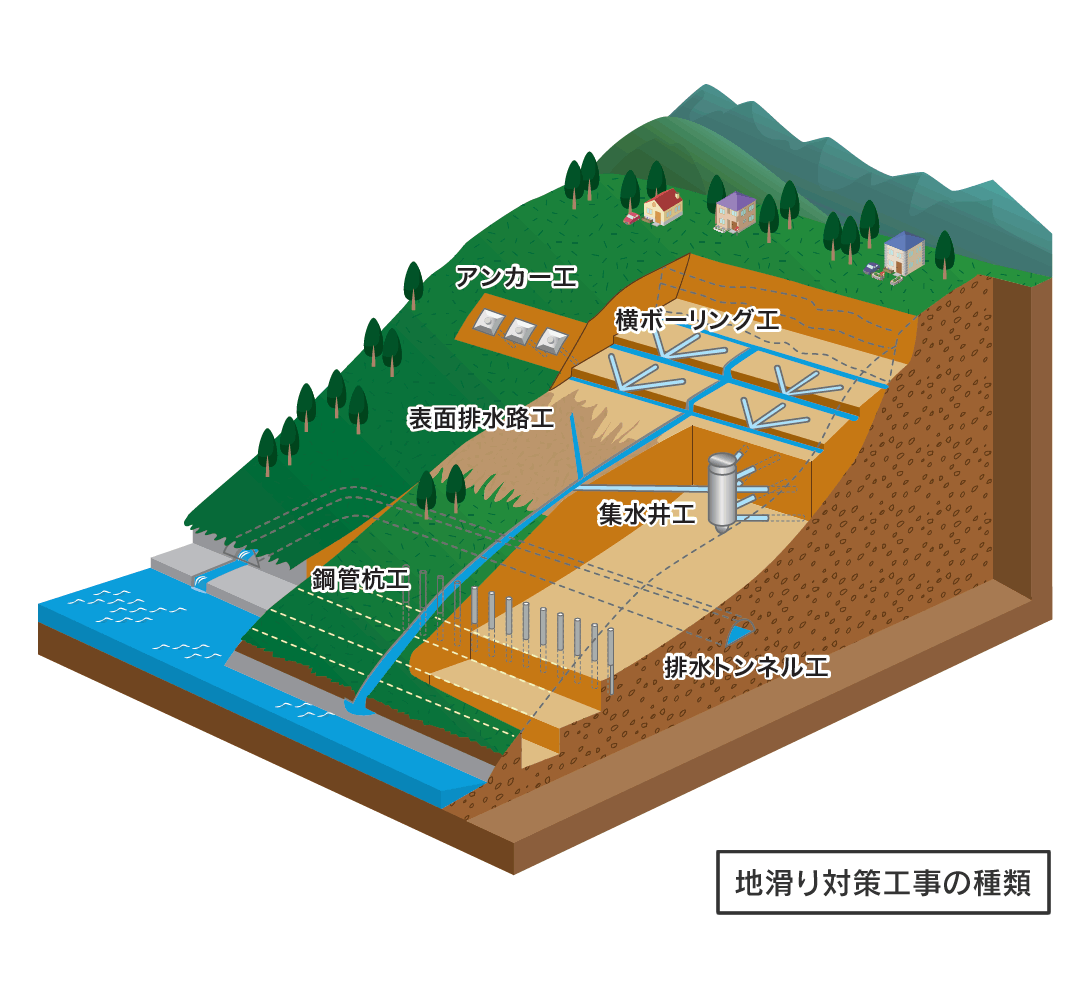 自然条件を変化させ改善することで地滑りを停止又、緩和をさせる工法